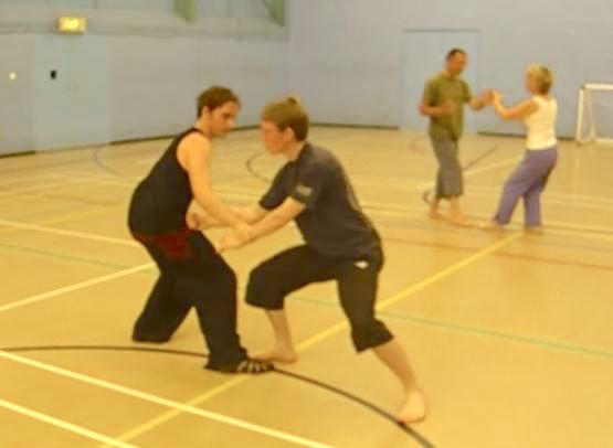 Most Taijiquan practitioners today practice only the external forms of Taijiquan, and some Taijiquan instructors believe that it is ineffective for fighting, not realizing that Taijiquan is an internal, martial art. The picture above shows participants of the Taijiquan course at the recent UK Summer Camp of July 2006 practicing combat application.