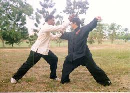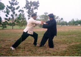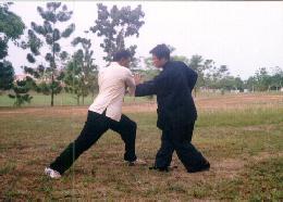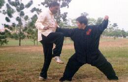 Instantly Sifu Wong moves forward his left leg into a left Bow-Arrow Stance and strikes Mogan's ribs with a cup-fist, in the Taijiquan pattern “Watching Fist Below Sleeves”. Mogan moves back his left leg a small step and simultaneously kicks at Sifu Wong's groin with his right leg. Sifu Wong quickly moves his left leg backward into the Taijiquan pattern “Low single Whip” to avoid the kick.