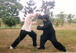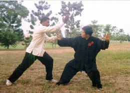You may be surprised that in my kungfu training system most of the time — and for many students, all the time — we do not need any equipments and weapons. For example, while students in other kungfu schools use sandbags and weights to increase their power, we use chi kung exercises like “Pushing Mountains” and “Golden Bridge” to develop internal force. While others use cycling machines and chest expanders to increase stamina, we use chi kung exercises like “Lifting the Sky” and “Separating Water”. We find that our approach is not only convenient and economical, it is also more efficient as we can train our energy and mind, and not just our muscles.