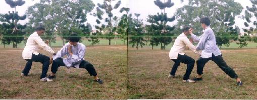 There are many ways to spar with an imaginary opponent. One effective way is as follows. Choose a few combat sequences you have learnt. Go over the combat sequences as if you are sparring with an opponent. Practise one sequence at a time, and repeat it many times before going to the next sequence.
