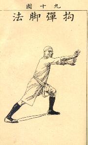 The "Hook-spring Leg Technique" demonstrated by the great master Lam Sai Weng. This is a well-known but little understood leg technique of Southern Shaolin Kungfu. Merely looking at the illustration, very few people could know what the technique is about. I have no doubt that this technique is very effective. In my early days of kungfu training I once used this technique during sparring to fell my si-heng (senior classmate) -- quite to our surprise. This was a significant landmark in my kungfu development, for my si-heng was best known among kungfu circles for his stable horse-stance!