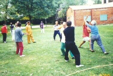 Sparring is an essential part in all kungfu training, including in Taijiquan. Here a class of Taijiquan exponents are engaged in sparring practice, while Sifu Wong looks on.