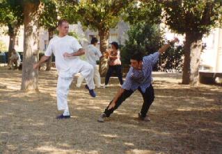 Combat application using typical kungfu patterns, instead of bouncing about as in Western Boxing, should be an essential part of any martial art training. Here in a sparring practice during a Taijiquan class, Javier uses “Low Stance Single Whip” against Inaki's kick.