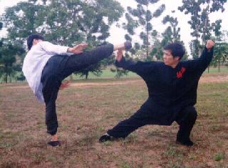 Combat Application of Tai Chi Chuan. Sifu Wong uses “Low Stance Single Whip” to counter Tai Chee Yong's kick.