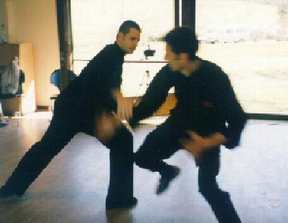 One important criterion to decide whether one's kungfu, a martial art, is genuine is to see whether he can free spar using his kungfu forms. Here in a free sparring session during a break in a qigong class in Switzerland, Master Dan Hartwright (left side), a Shaolin Kungfu instructor from Shaolin Wahnam England, and Professor Javier Galve (right side), a Wahnam Taijiquan instructor from Shaoln Wahnam Spain, are engaged in free sparring practice. All their movements are not pre-arranged, yet they use typical Shaolin and Taijiquan patterns respectively.