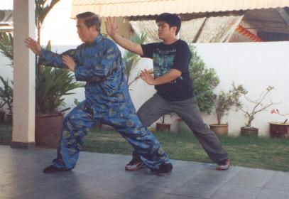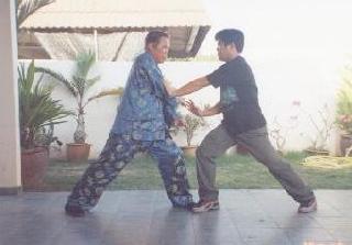 Wong Choon Nga “tames” Sifu Wong's arms with his left hand. Notice that in this position, Sifu Wong could not use either of his two hands for attack or defence.