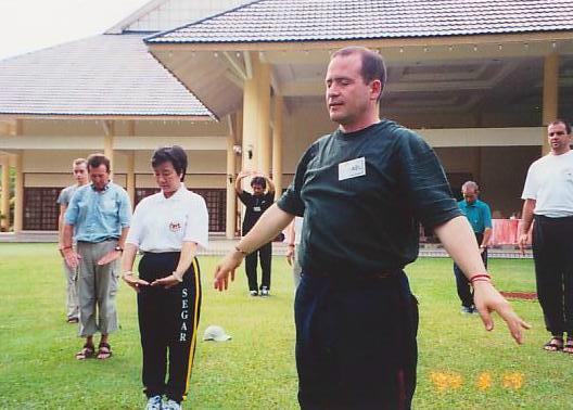 Rafael Castro, who is our Shaolin Wahnam chi kung instructor in Colombia, enjoying “Lifting the Sky” while in a chi kung state of mind during an Intensive Chi Kung Course in Malaysia in 2002. The other participants — from left: Markus, Mr and Mrs Liew, Dr Damian Kissey, Rafael, Mr Kissey Senior, Piti — were also in a chi kung state of mind.
