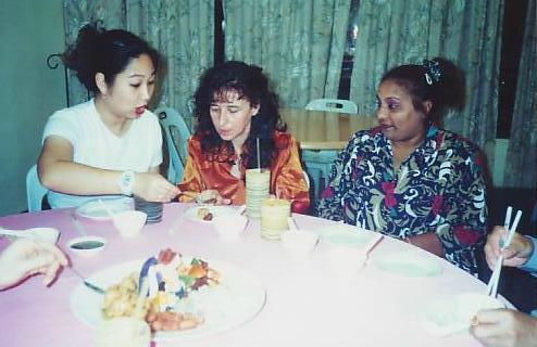 Emiko from Canada serving some delicasies to Adalia from Spain at the graduation dinner of an Intensive Shaolin Kungfu Course in Malaysia in December 2000, while Neeta from Malaysia looked on.