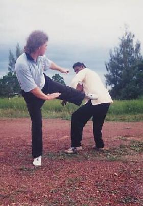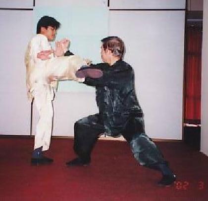 Peter from the United States employed the tactic of false moves on Mogan from Malaysia in a combat sequence at an Intensive Shaolin Kungfu Course in Malzysia a few years ago. First, Peter attacked Mogan's ribs with a left leopard punch (not shown in picture). As Mogan responded with a hand-sweep, Peter moved to his right side to attack Mogan's ribs again with a side kick, using the pattern “Happy Bird Hops up a Branch”.