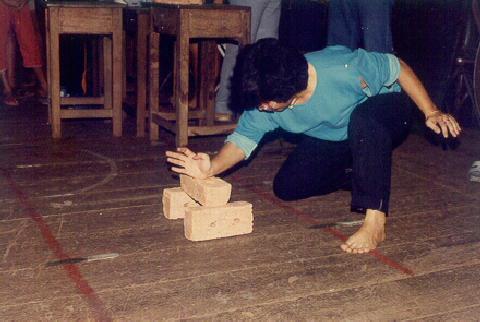 This old photograph taken about 20 years ago shows a female student of Sifu Wong use internal force to break a brick