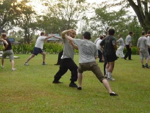 Sparring using typical kungfu patterns, as shown here during the Intensive Shaolin Kungfu Course in Malaysia in November 2004, is an essential aspect of genuine, traditional Shaolin Kungfu. In the foreground, Mohamed from England attacks with “Hang a Golden Star at a Corner”, and Innes from Scotland responds with “Immortal Emerges from Cave”.