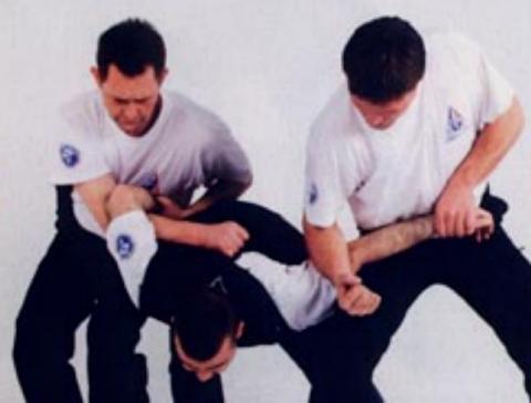 In the second picture, you should first prevent the attackers breaking your elbow by relaxing your arm and bending it slightly. Swing your arm downward while moving back simultaneously, using a Shaolin pattern called “Black Crow Folds Wings”. Then move forward and turn around to face your two opponents. Please see the video clip here. Some internal force is needed to execute this pattern effectively. Moreover, the demonstrator, Innes, is quite big sized, which may give the mis-conception that he overcame the combat situation with mere strength.