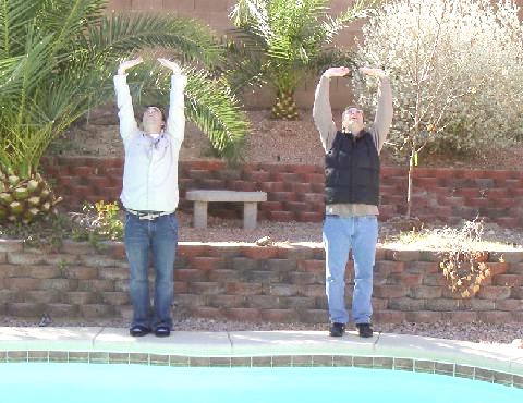 “Lifting the Sky” is considered a wondrous exercise in Shaolin Wahnam as it can be practiced for so many different purposes at vastly different levels by both beginners and masters. Here Sifu Eugene Siterman and Sifu Anthony Spinicchia, both of Shaolin Wahnam USA, practice “Lifting the Sky” at the pool-side of Sifu Anthony's house.