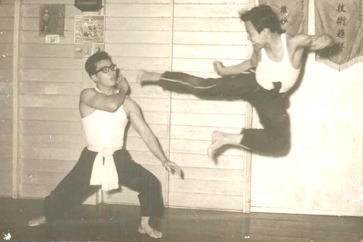 An old photo showing Liang executing a flying kick at Yong during a sparring session. Both are inner-chamber disciples of Grandmaster Ho, and senior classmates of Grandmaster Wong.