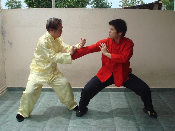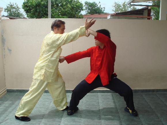 Grandmaster Wong attacks Sifu Wong Chun Nga with “Hungry Tiger Snatches Goat”. Sifu Wong Chun Nga brushes away the attack as he moves diagonally aside, and counters with a pattern from the Taming-Tiger Set, namely “Slant Body Strike Tiger”, striking Grandmaster Wong's ribs.