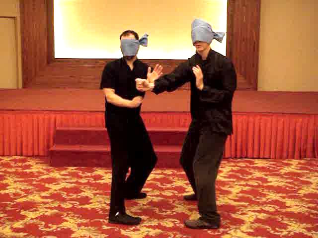 Sifu Tim Franklin and Sifu Robin Gamble practicing Chi Sau while being blind-folded