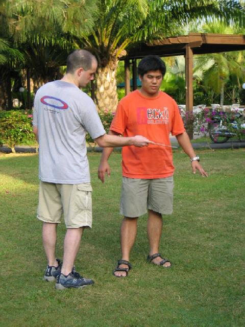He must be out of his mind then. Without exaggeration, he swung his body fully backward. I was then talking with some other students, but saw his movement from a corner of my eye. I thought he was joking by exaggerating his movement. The next moment the chopper was swung with full force at me! It hit me at my stomach and was bounced away about twenty feet. Luckily it did not hit anybody in its re-bounce or else it would have killed him even if hit on the blunt edge.