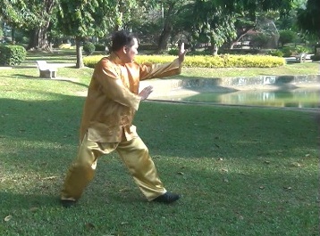 When performing "Single Tiger Emerges from Cave" in a poise mode, we can be quite far from an opponent as he is still some distance from the arena. But when we use it to "lean" on the opponent, which means the opponent is near, the forearm is slightly bent. It should be "lean" and not "block", and the exponent should move a small distance backward. A failure to realize this often results in bruises on the exponent.