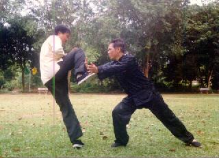 Combat Application of Taijiquan. Goh Kok Hin attacks Sifu Wong with a side kick. Sifu Wong catches the attacking leg with the “lu technique” or “roll back” of “Grasping Sparrows' Tail”.