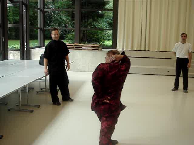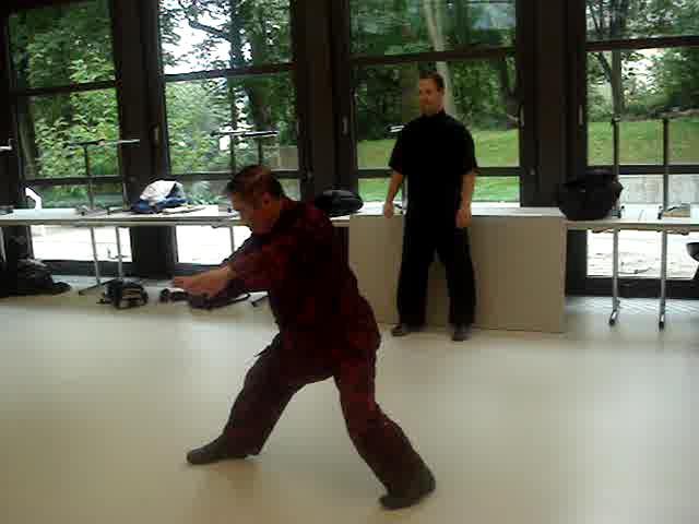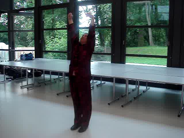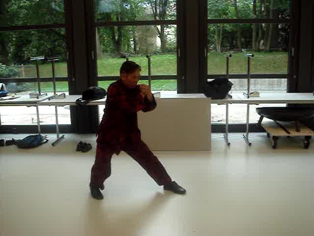 Needless to say, the pictures below show only one point in time of the external forms. One must understand their chi flow and other internal aspects to develop internal force, and this must be learnt personally from a competent teacher. For example, many course participants at the Praying Mantis Course in Switzerland expressed amazement at the benefits from the first pattern, "Lohan Worships Buddha". But merely looking at the picture cannot give any clue to how these benefits are derived.