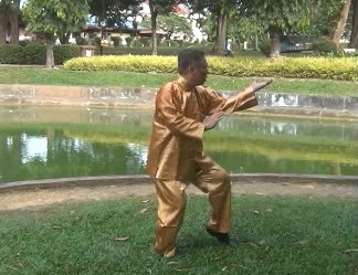 The cockerel is very important in Xingyiquan, but in Southern Shaolin it is incorporated into the crane. "Golden Cockerel Stands Solitarily" in Southern Shaolin is sometimes called "White Crane Flaps Wings". Xingyiquan cockerel finds its way into Taijiquan, but the spirit is quite different. In Xingyiquan the cockerel is aggressive, but in Taijiquan, as in "Golden Cockerel Stands Solitarily", the form is different from that in Southern Shaolin, and it is unobtrusive.