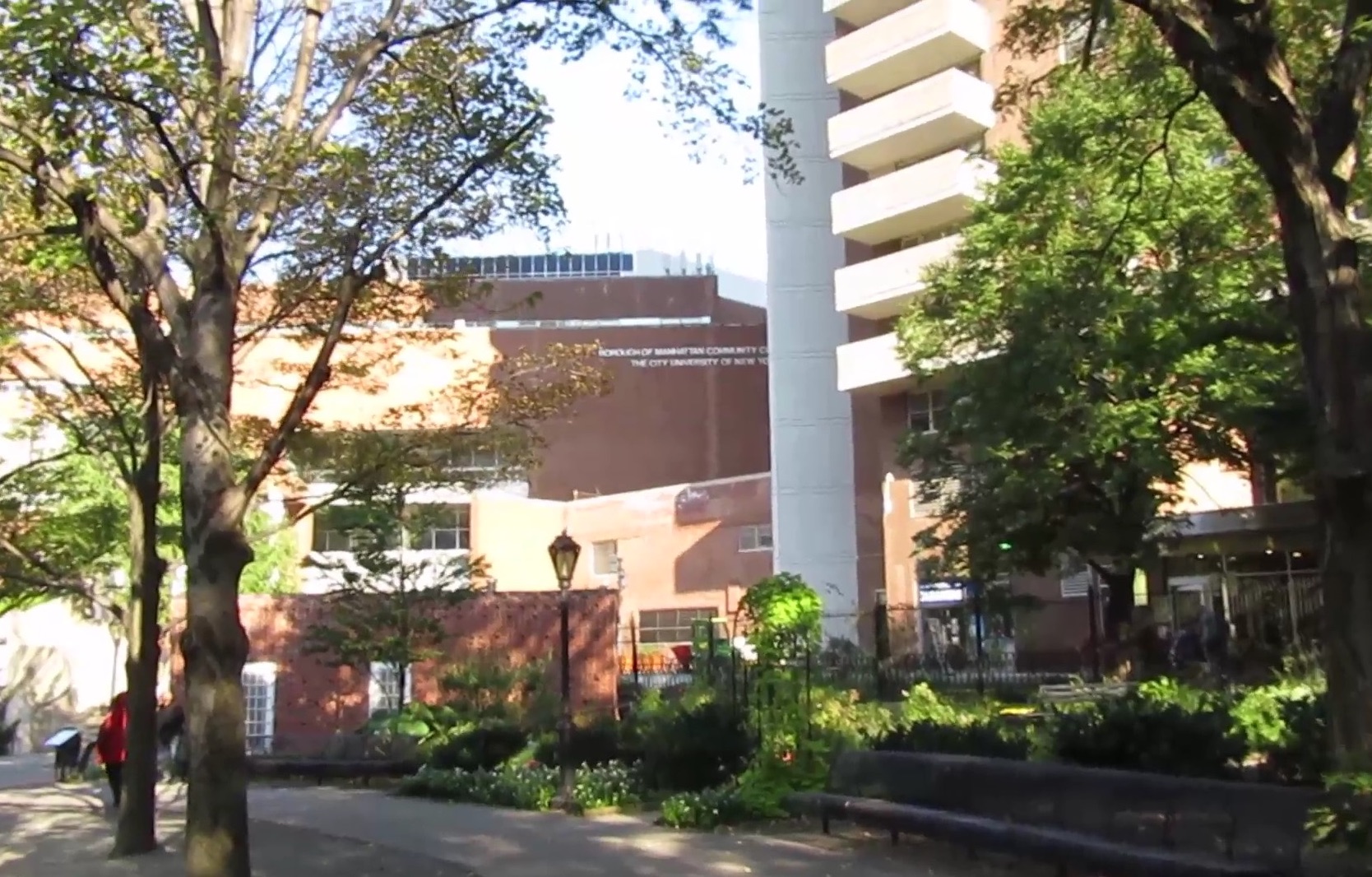 Borough of Manhattan Community College, which is a public university, is housed atop a small hill. There is a garden below it where many people come to relax.