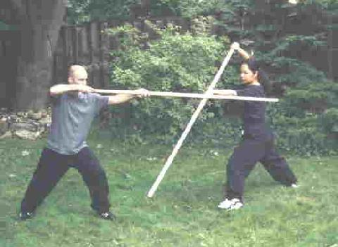 Instead of thrusting back immediately, Anthony circles his staff around Emiko's staff and then thrust in from the outside. Emiko responds using the pattern "High Mountain Flowing Water".