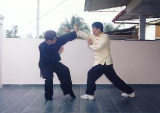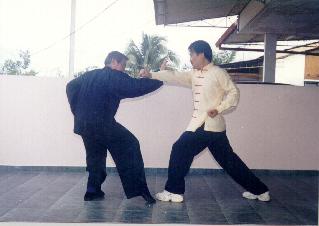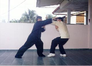 Two new skills are introduced in this sequence training: the skill of flowing attack and the skills of pressing attack. As your opponent sweeps at your low punch at “Precious Duck Swims through Lotus”, you flow with the opponent's momentum and swing your attacking arm upward in a curve into a “horn punch” at his temple, simultaneously you press in a small step and guard his sweeping hand. If you do not cover his hand, he may pierce it into your side ribs or bowels. Hence, this attack movement involves three skills: the skills of flowing attack, or pressing attack, and of safe coverage.
