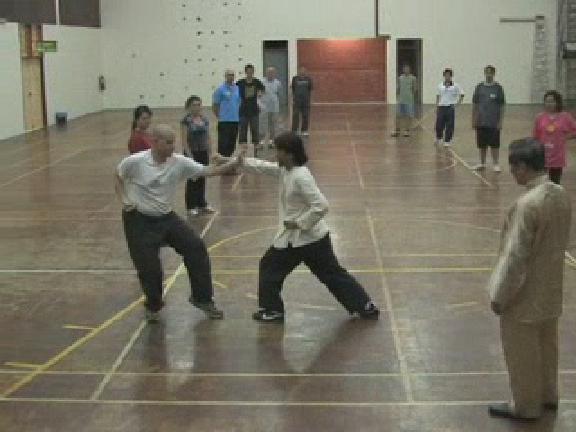 Let's presume that he initiates. Since I am in a relatively long stance and have 50% of my weight on each leg, some people might assume that I have very little mobility, or in Taijiquan terms, that I have "the weakness of double yang."