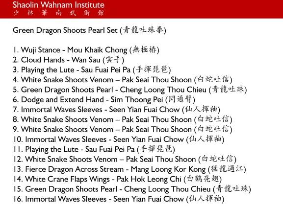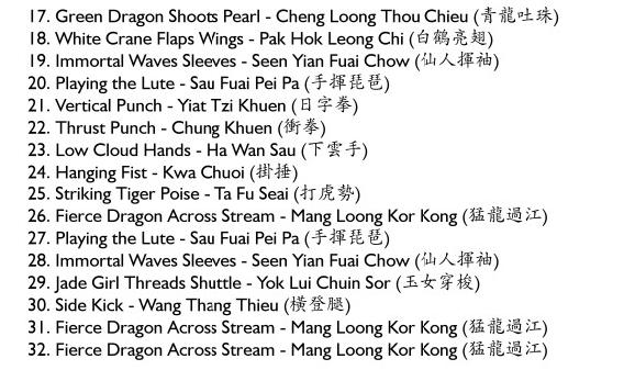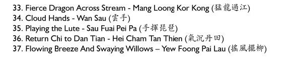 The names of the patterns, the Chinese (Cantonese) pronunciation and the Chinese characters are provided by Michael Chow of Shaolin Wahnam Canada. We wish to thank Michael Chow for his splendid effort.