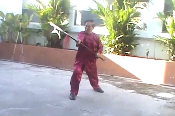 Grandmaster Wong demonstrating a pattern called "Green Dragon Lifts Head" from the Traveling Dragon Crescent Moon Spear Set