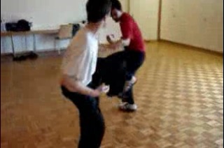 What would you do if your opponent pulls you down and simultaneously chops at your head? You can neutralize his attack and counter with an organ-seeking kick.