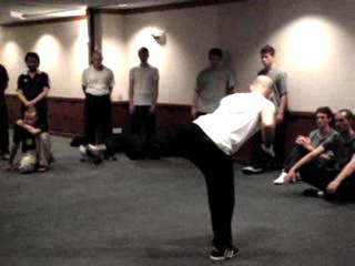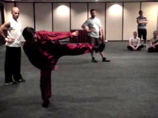 “Yellow Bird Plays with Water” is normally an organ-seeking kick. But here Sifu Anthony Korahais performs the pattern not as an organ-seeking kick but as a nail-kick. In an organ-seeking kick the in-step is used to kick, whereas in a nail-kick the toes are used. When would a nail-kick preferred to an organ-seeking kick?
