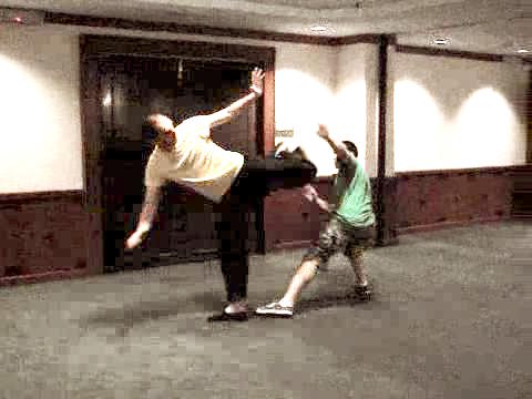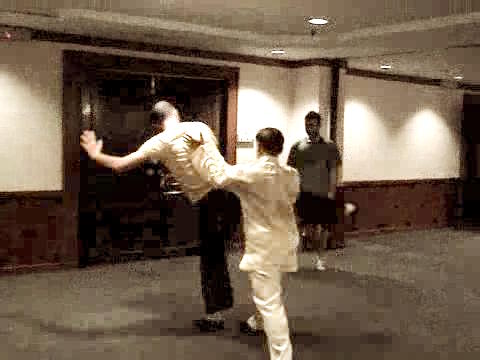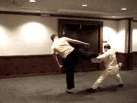 Innes executes a low kick, a high kick and a middle kick at Sifu Eugene. Grandmaster Wong shows Sifu Eugene how to trap Innes' leg using “Two Tigers Subdue Dragon” after dodging the first two kicks. Notice that instead of moving his feet back, Grandmaster Wong sinks back his body to “swallow” the middle kick.