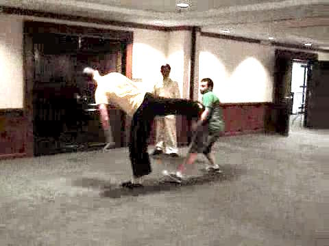 Grandmaster Wong demonstrates another effective pattern against the reverse round-house. It is called “Double Dragons Cross Step”, where the opponent is struck often without knowing where. Notice that in the application of this pattern, the exponent follows the momentum of the opponent. Grandmaster Wong used this pattern very often when he sparred with Taekwondo blackbelts in his young days.