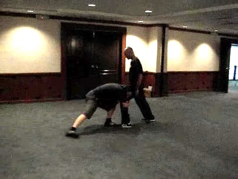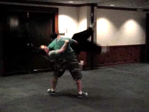 Here is still another Wrestling throw, the uplift, demonstrated by Sifu Eugene on Adam. An obvious indication this is a Wrestling throw and not a Shaolin throw is that the opponent's left hand is not covered and thus may execute a surprised counter-attack. In Shaolin Kungfu, a similar pattern but where the opponent is safely covered is known as “Lohan Emptying Rucksack”