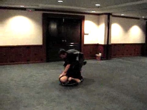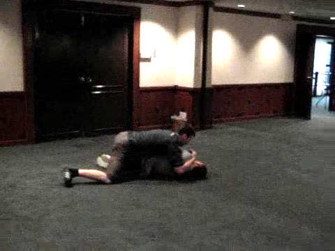 As Adam attempts the shoot, Sifu Roland counters with “Hiding Flowers in the Sleeves”, which could suffocate the opponent with an arm lock on his neck. In a real fight, the exponent could tear the attacker's throat or gorge the attacker's eyes.