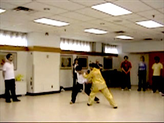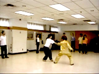 Now the roles are reversed. The opponent attacks with the swinging fists of “Three Rings Around the Moon”. The exponent uses just one pattern, “Green Dragon Shoots Pearl”, to counter the opponent's varied attacks.