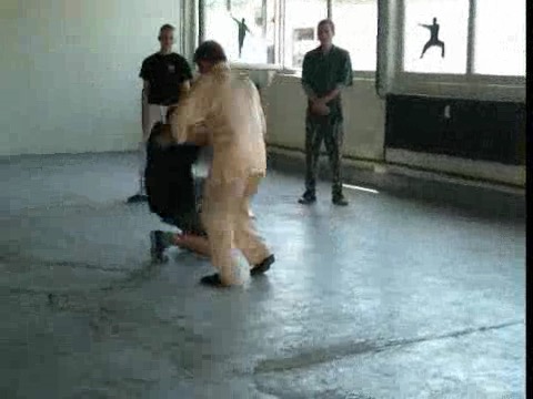 A more sophisticated counter against a Kick-Boxer is to fell him when he kicks. A good pattern to use is “Fell Tree with Roots”. As he kicks, moves back to avoid the kick. As soon as he places his kicking leg on the ground, move in to fell him. It is important to cover him as you move in.